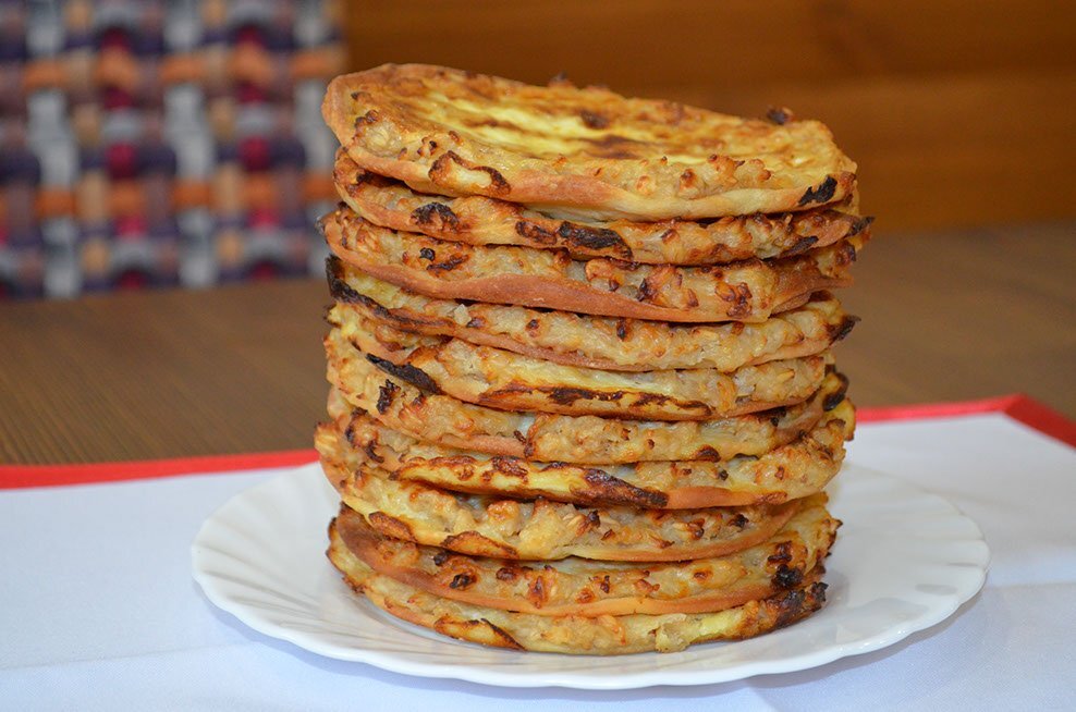 Лепешку слегка подрумянить в жарочном шкафу, затем смазать густой смесью овсяной муки, простокваши или кефира и сметаны. Блин снова подрумянить, затем положить третий слой - овсяную крупу, которую в течение 8-10 часов вымачивали в сметане.